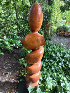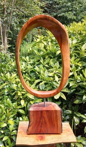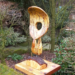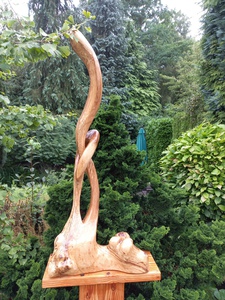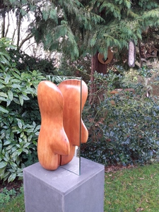 Deze sculptuur is van een zwarte Moerbei gemaakt - een prachtige boomsoort bij het werken eraan laat ik bewust veel licht gekleurd hout ( genaamd het Spint ) aan zitten dit vooral vanwege de mooie kleur veschillen zeker als de moerbei in tijdje in de buitenlucht staat dan wordt het kernhout heel mooi donker tegen zwart aan