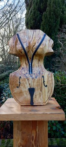 De combinatie Berk en Slaap hoort bij elkaar . De boomsoort Berk heeft voor de Beeldhouwer altijd een extra dimensie door de schimmel Slaap die in elke berk voorkomt. De tekening van deze zilverberk is echt subliem en het gegeven (muze en cello) wat ik uit het hout haal spreekt voor zich.